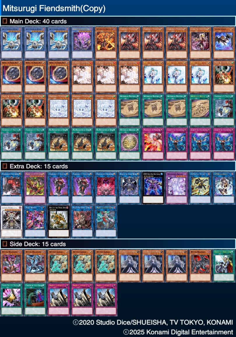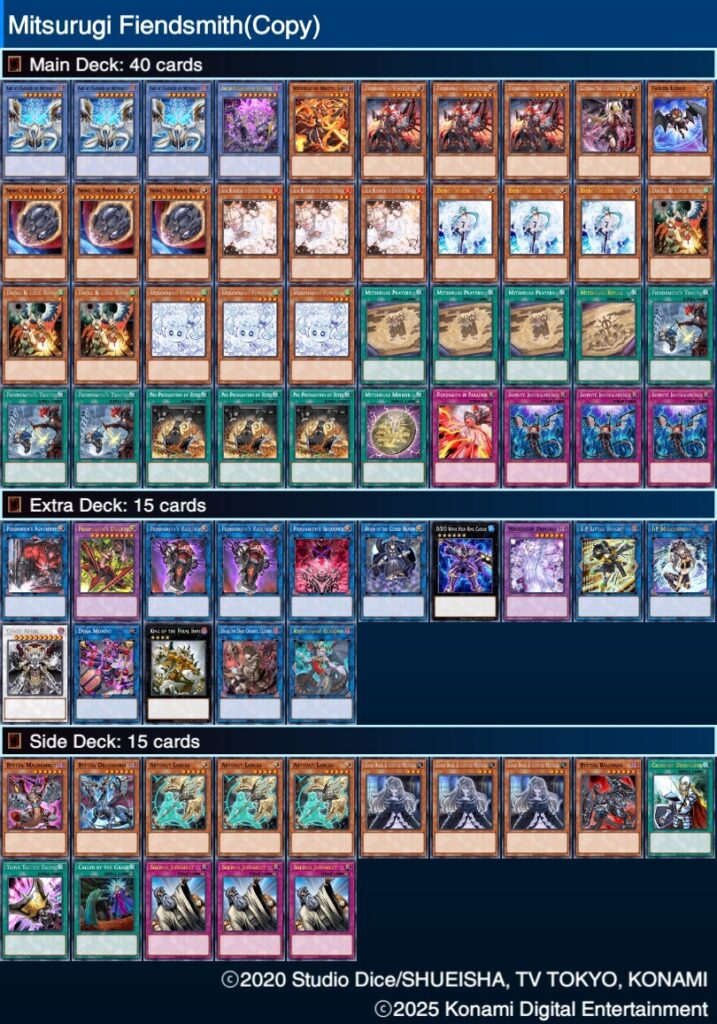 O torneio teve 5 rodadas, e eu terminei ele 5-0-0. Como o pessoal local já sabe, eu joguei de Mitsurugi Fiendsmith, um deck que tenho testado já há quase 1 mês, mas que pela primeira vez em um torneio eu senti que esse deck é realmente muito forte (explicarei mais na frente sobre).